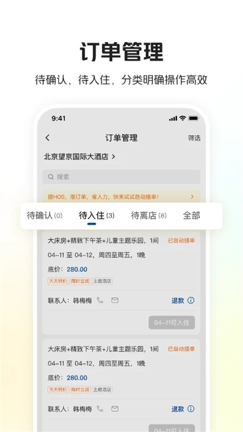 1、预定管理 顾客上线预约,一键确认,免去繁琐的沟通。 2、房态管理 随时开关房,操作方便自由安排时间。 3、评价管理 查看评价,回复顾客,提升酒店排名。 4、生意参谋 项目排名,门店效果先看就看,助你提升销量。 5、团购管理 团购验证与查询,操作快速便利。 6、酒店信息 自助管理酒店信息,一切都在掌握之中。应用优势