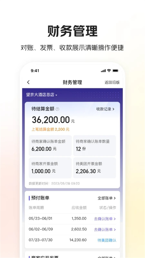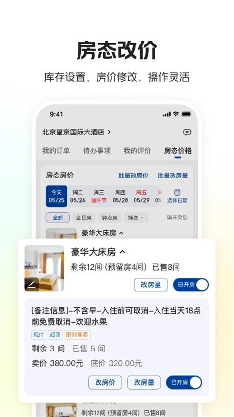 1、手机接单、开关房,特方便。 2、查看评论、自助改价、验证美团券等。 3、快速了解您和对手的销售数据。 4、一键找到您的专属业务经理。更新日志