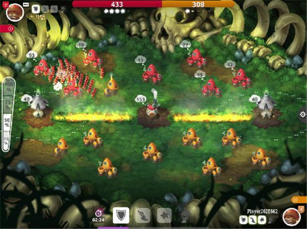 当首领拥有一定实力(人(菌)口)后,便可以调兵遣将向四周进行扩张。出征时,可以通过调节左侧的百分比进度条,选择不同建筑内想要派出的士兵数量比例(25%、50%、75、100%)