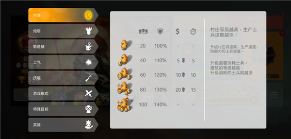 每个我方占据的村庄,都可以通过消耗建筑内一定数量的兵力升级。升级后的【村庄】不仅会将提高自身的防御力,也会影响生产士兵的速度以及该建筑内的士兵容量!