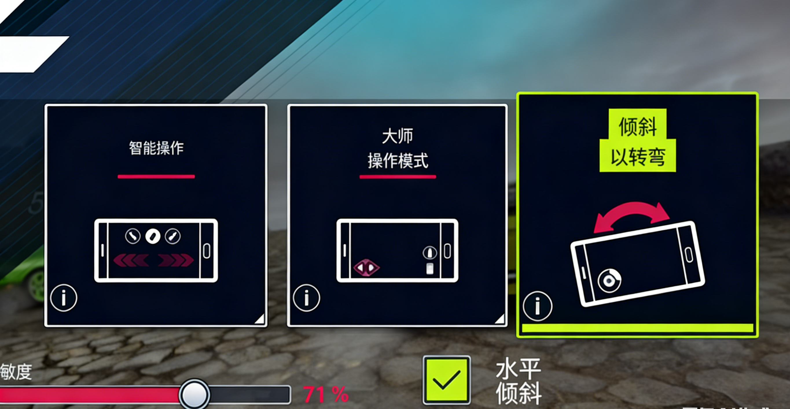 打开狂野飙车9游戏设置,就能切换不同的操作方式,第一种傻瓜操作基本没什么用,第二种和第三种是比较高级一点的操作,相比之下第三种重力感应的操作会更真实一些,操控起来给也更有代入感。