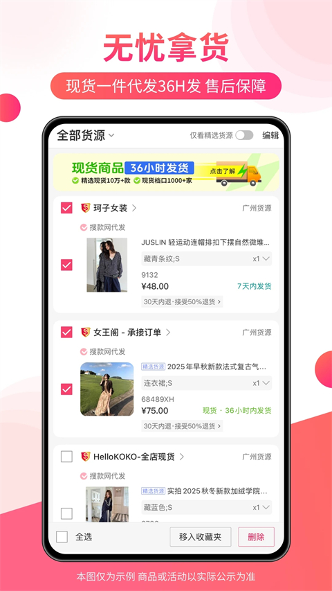 1、【全国货源】进源头货,卖好款式 搜款网汇集全国知名的一手服装批发市场,包括广州沙河,十三行,白马,万佳,南城,解放南鞋城,广东潮汕普宁,杭州四季青,杭州四季星座,深圳南油等一级批发市场。海量爆款女装、男装、童装、内衣、鞋、箱包等低价源头货源,足不出户也能随时看新款,进好货。 2、【利润更高】只做一手货源,厂家直销,价格透明 搜款网的服装货源都是一级批发商供货,直接对接工厂,价格实惠。帮你节省拿货成本,提高利润空间。 3、【一件起批】告别5件,10件才能起批的烦恼 在搜款网上的服装款式都是一件起批一件代发全国,再也不用高成本囤货,不管是实体店还是淘宝/拼多多/直播达人等网店店主,都能用搜款网实现0库存0成本开店。 4、【一键上款】5秒铺货10大平台 只要你看中,就能上架卖。商品图、视频及商品详情信息都能一键上传到淘宝、天猫、1688、拼多多、抖音、快手、微信、小红书等平台。再也不用自己到处找图抠图啦。 5、【采购效率更高】足不出户,轻松进货 用搜款网进货,你只需要专心经营店铺,我们帮你跑市场拿货、质检、发货、退货。再也不用起早贪黑跑市场、不用到处拉人拼货。 6、【卖的更好】海量网红爆款每日上新,更有精选优质现货货源 每天同步上新各大源头批发商的新款式,紧跟流行趋势,韩国东大门、日系、欧美时尚潮流新款应有尽有。 7、【大家都在用】线下服装实体店和线上网店货源全覆盖 不管你是线下门店的实体店店主,还是淘宝、1688、抖音、拼多多、小红书、微店、直播达人的网店店主,甚至是没有网店的朋友圈卖家,都能用搜款网找到符合店铺风格和档次的服装批发货源,帮你省钱、省心做生意!软件亮点
