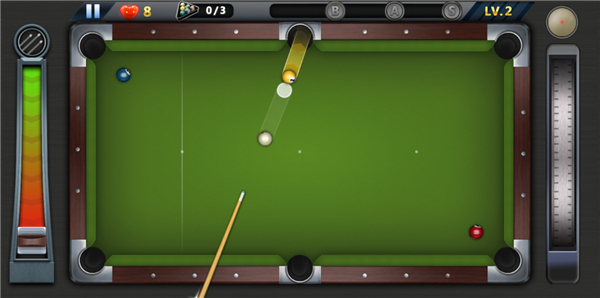3、游戏玩法完美还原台球玩法,左边为力气操作、右边为角度操作;