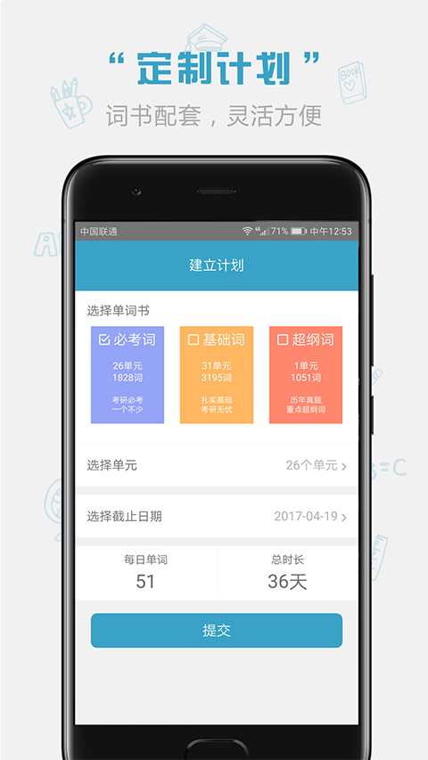 1、打卡日历: 每日签到,记录学习情况,通过考勤,督促用户坚持学习。 2、调整计划: 用户可根据自身情况,对《【红宝书】考研英语词汇》必考词(26个单元)、基础词(30个单元)、超纲词(A-D)灵活制定学习计划。 3、单词本: 用户已经学习掌握的词汇都会记录在单词本里,使用户随时了解学习进度。 4、记忆模式: “中——英”和“英——中”两种方式复习记忆单词。 5、学习资源: 考研英语学习资料应有尽有。软件特色