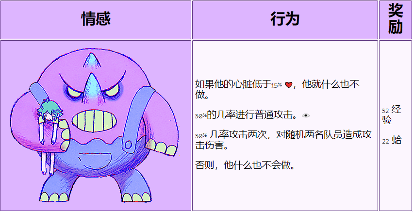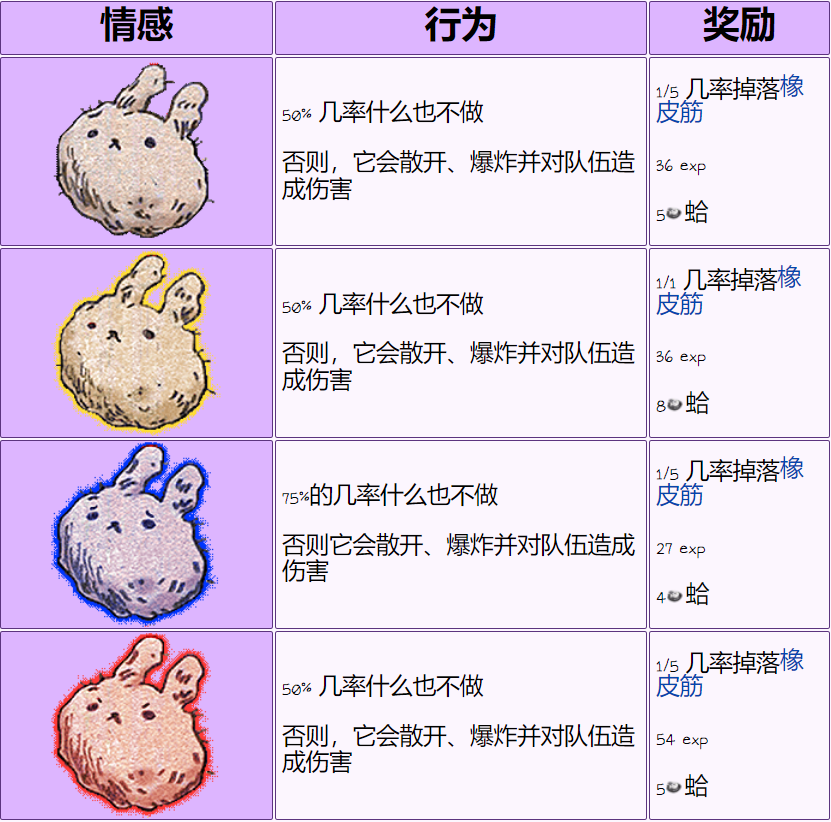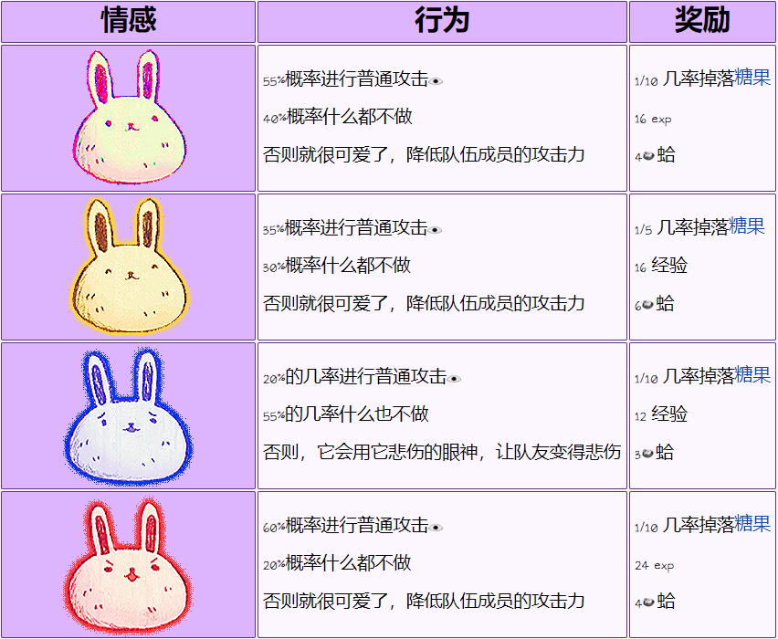 【森林兔子】 森林兔子是玩家最先遇到的敌人之一,可以在广阔森林和风车森林中找到。一个名为森林兔子的颠倒变体?也可以在广阔森林中找到。像大多数敌人一样,它会根据其情绪采取不同的行动。 战斗公式: 攻击:默认伤害。 可爱一点:攻击力降低一级。 悲伤的眼睛:增加一层悲伤。