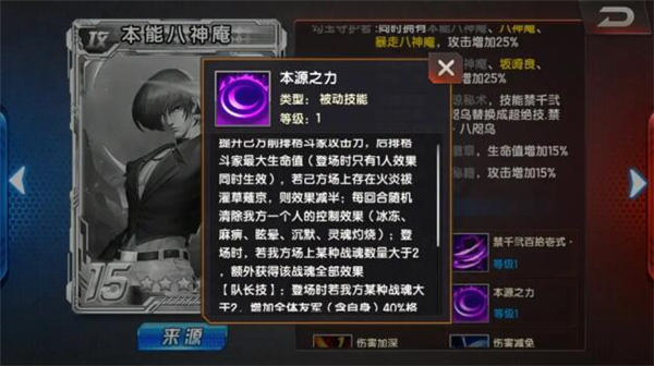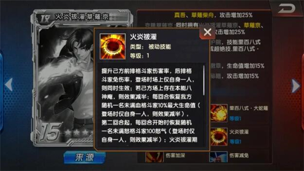 提升己方前排格斗家伤害率,后排格斗家免伤率,登场时场上仅自身一人,则同时生效;若己方场上存在本能八神庵,则效果减半;每回合恢复我方随机一名未满血格斗家10%最大生命值(登场时仅自身一人,则效果减半),第二回合起,每回合开始时恢复随机一名未满怒格斗家100怒气(登场时仅自身一人,则效果减半);火炎祓濯期间,火炎祓濯草薤京获得20%攻防;登场时若我方只缺少一种战魂(虎、熊、蛇、龟中的一种),火炎祓濯草薤京获得该种战魂的全部效果,并被视为该战魂;若我方已存在四种战魂,火炎祓濯草薤京获得四种战魂的部分效果,首回合免疫控制,仍视作真空之魂。