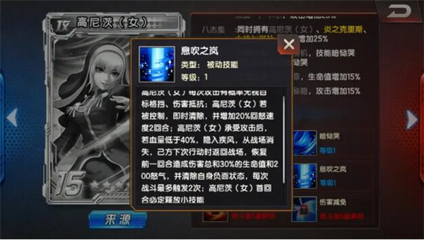 高尼兹每次攻击有概率无视目标格挡、伤害抵抗;高尼茨(女)若被控制,即时清除,并增加20%回怒速度2回合:高尼茨(女)承受攻击后,若血量低于40%,隐入疾风,从战场消失,己方下次行动时返回战场,恢复前一回合造成伤害总和30%的生命值和20O怒气,并清除自身负面状态,每次战斗最多触发2次;高尼茨(女)首回合必定释放小技能。