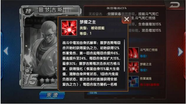 战斗中增加自身抗暴率;器梦吉斯每回合开始时获得复仇之力,初始获得12%伤害免伤,第一回合起每回合提升6%,最高提升至24%,每回合体型扩大15%,最多30%;噩梦吉斯每次击杀对方格斗家,获得强化(恢复自身15%最大生命值,清除自身异常状态,1回合内免疫负面状态,首次击杀时直接获得全部复仇之力);每回合敌方随机一名格。斗家陷入噩梦,持续1回合,噩梦吉斯登场时,若敌我双方均仅一人,则此效果不生效;器梦吉斯免疫噩梦提升自身40%抗暴率。