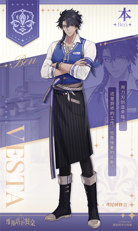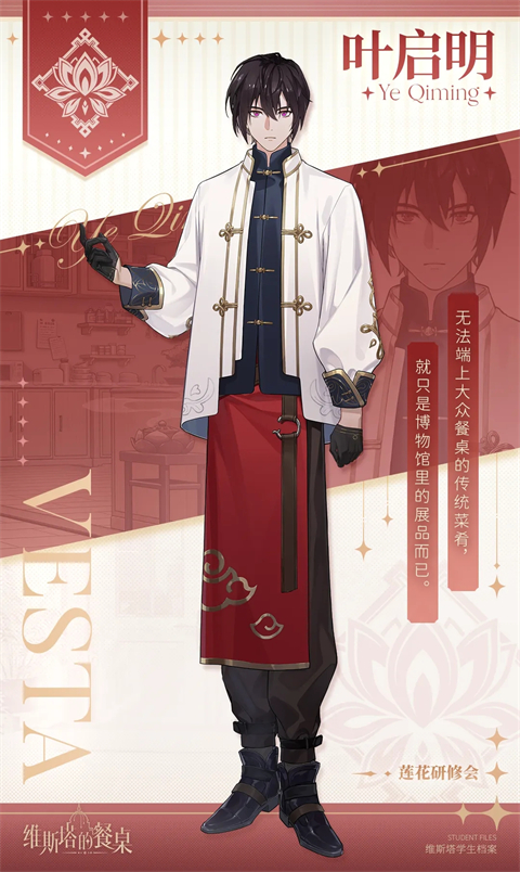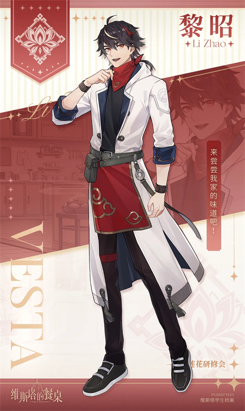 维斯塔学院中供奉着神秘的长明之火,传说它借由人们对美食的热爱保持长明不灭,并会对真心热爱烹饪之人加以庇护,让他们做出能让人与烹饪者的心情共鸣的美食。 珀那提斯的住民们将长明之火视为美食的象征,每逢收获季节,珀纳提斯甚至会举行盛大的火之庆典,庆贺丰收与富足的生活。火焰带来了温暖,带来光明,也带来进步。一直以来,长明之火都是学院的精神象征,它是美食的感召,以人类对美食的热爱作为燃料,给予厨师们温暖的祝福,照耀着一代又一代来此求学的学徒,成为大家的精神支柱。 然而数年前的一天,不灭的火焰突然停止燃烧,无论人们怎样尝试都无法使其重燃。 就在众人心灰意冷之时,一名年幼的孩童为躲避风雪而误入了神圣的礼堂,早已冰冷的点火台上,又再度亮起了炽热的光芒。维塔斯餐桌游戏人物档案