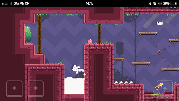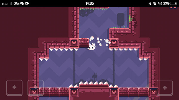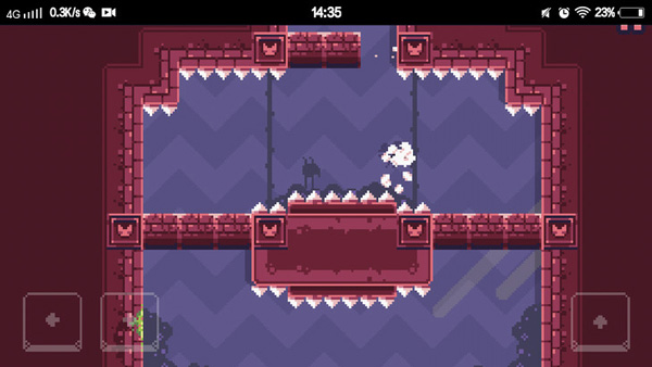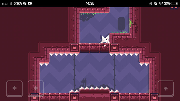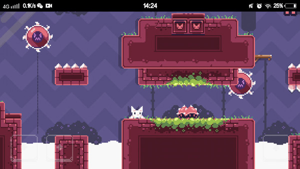 在后面的关卡中,玩家朋友们将会遇到很多的障碍物,有的时候猫咪下落的速度太快,就来不及躲避这些障碍物了。像上图所示的猫咪,脚下踩的是软踏踏的砖块,过不了几秒砖块就会自动消失,而猫咪也会顺势掉下去踩中尖锐的刺一命呜呼。