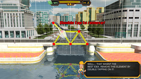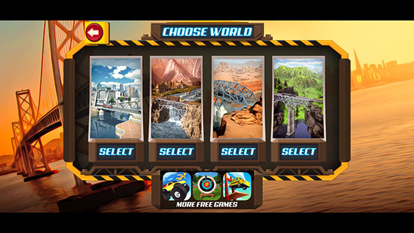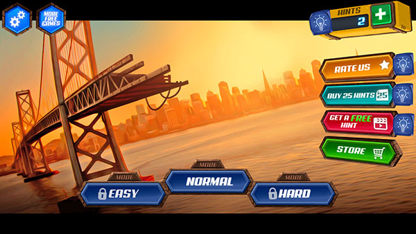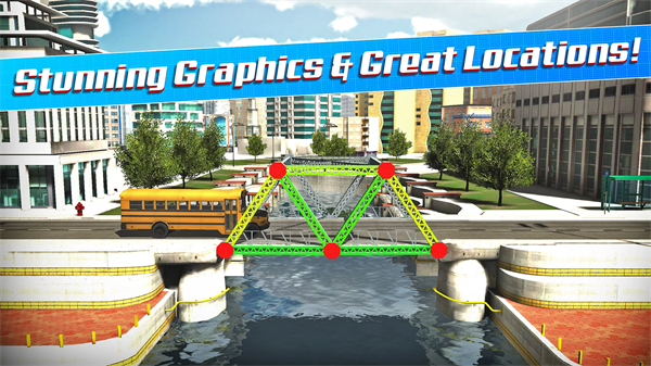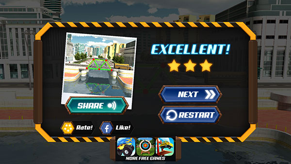 1、自由构建模式和帮助系统。 2、多种场景,包括城市、峡谷、海滩、山脉、丘陵。 3、桥梁设计师游戏还改进了格点系统。 4、包含所有已解锁世界/关卡的地图。 5、多种不同的建筑材料:木头、钢筋、钢索、混凝土支柱。 6、有颜色编码的加载指示器对应不同的建筑材料。 7、三种不同的负重水平:汽车、卡车和罐车。桥梁设计师游戏怎么玩