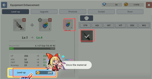 5、为了增强战斗力,玩家需要强化武器,来到背包中,给刀升级需要额外的刀,加上经验石。