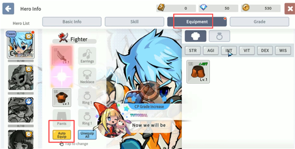 3、选择【Equipment】装备一栏,点击【Auto Equip】自动装备,系统将自动穿戴上新获得的装备。