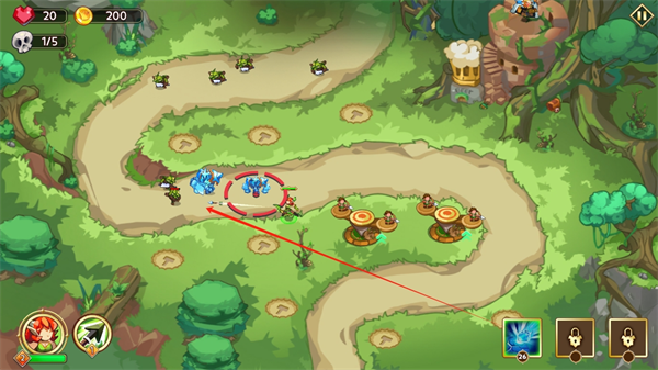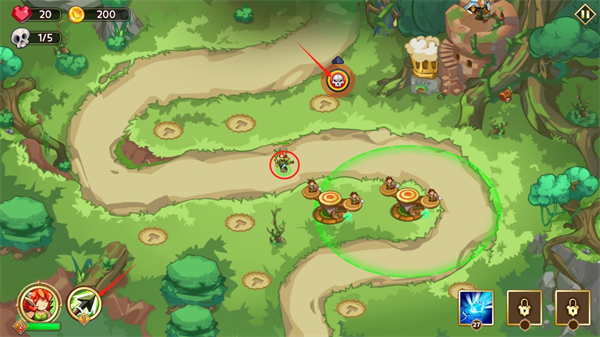 3、这是你的小小英雄左下角是他的技能,建设好了所有布局后点击骷髅头就会出现敌人。