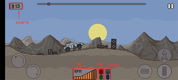 7、中间下方是能量和速度等,左上角是僵尸人数,开始行驶;