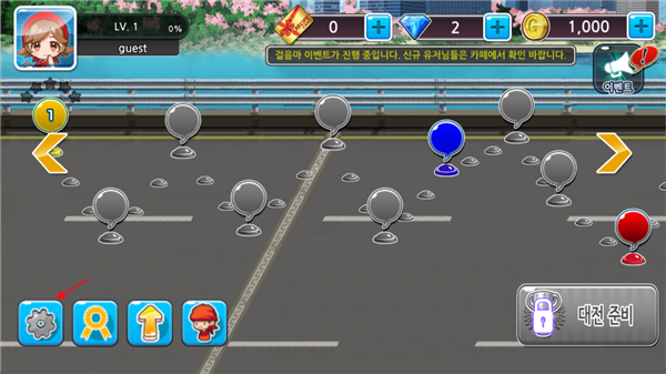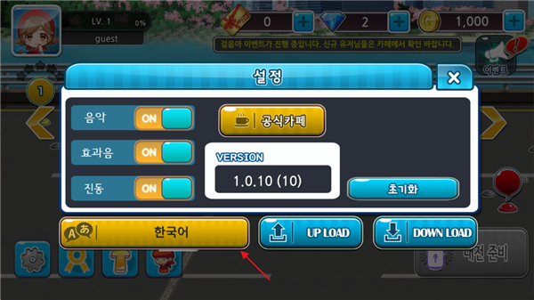 1、玩家首次进入游戏是韩文,点击左下角的设置;