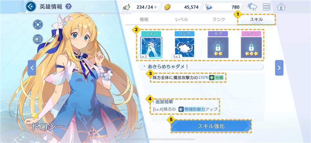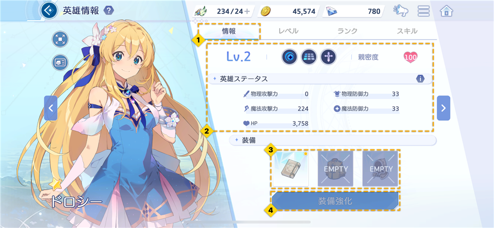 1)英雄等级:检查英雄的当前等级和基于等级的增强状态,并升级。