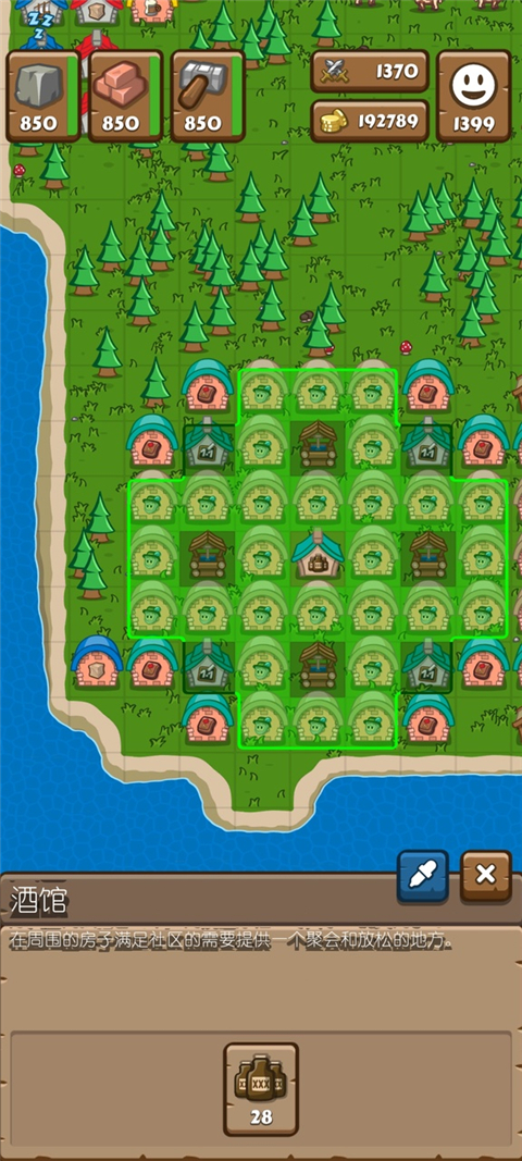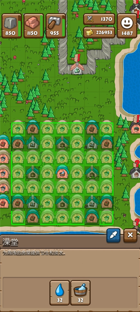 2、商人需要把澡堂替代井,然后和酒吧换一下位置,因为澡堂覆盖范围大,所以现在整个正方形都能覆盖到。