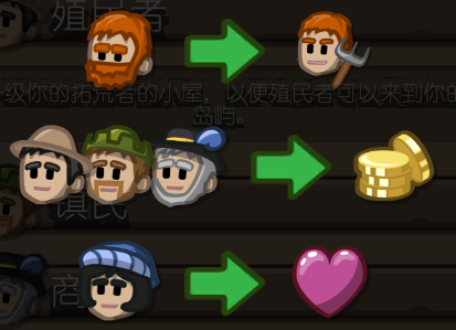 每一种村民都会为你生产一种资源。他们的奢侈品需求得到的满足越多,你就会得到越多的资源。请注意,商人比城镇居民缴纳更多的税,而城镇居民又比殖民者缴纳更多的税。因此,商家是赚更多钱的最佳选择。但是因为你也需要民兵和支持才能成功,所以建议你混合不同的村民阶级,而不是同时升级你所有的房子。