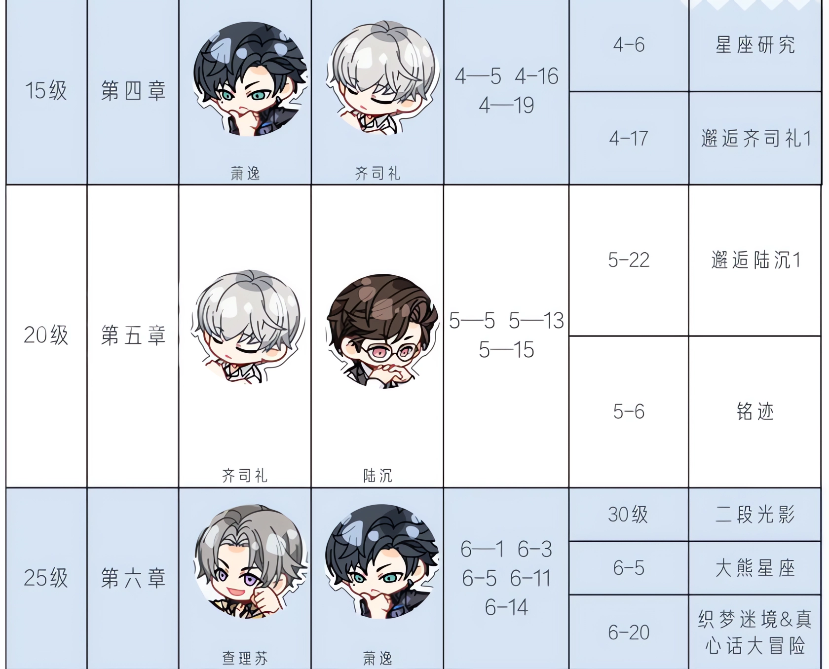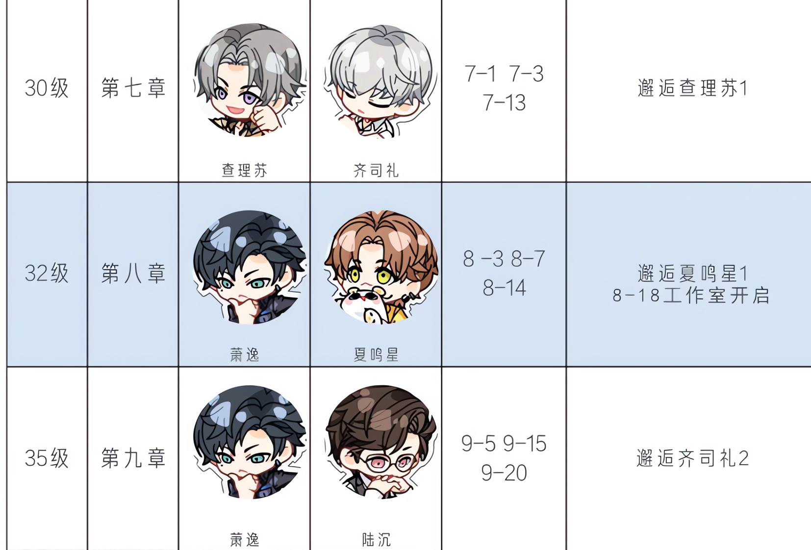 以下为前1-8章光夜选择对应男主的结局 1、第一章:光萧逸,夜陆沉; 光:女主帮萧逸处理好伤口同时避开了搜捕; 夜:女主送了陆沉领带夹; 2、第二章:光齐司礼,夜陆沉; 光:女主在齐司礼的指导下搞定工作; 夜:陆沉帮助女主完成补色工作; 3、第三章:光萧逸,夜陆沉; 光:萧逸保护了身处危险的女主,将女主送回家,并且邀请女主一同观看下周比赛; 夜:陆沉保护了身处危险的女主,同时触发纸蝴蝶对话; 4、第四章:光萧逸,夜齐司礼; 光:女主与萧逸一同去鞋店学习制作鞋子,两人走后齐司礼出现,触发和鞋店老板的剧情; 夜:女主在去鞋店的路上碰上齐司礼,女主得到鞋子离开鞋店之后,齐司礼出现和鞋店老板开启后面剧情对话; 5、第五章:光齐司礼,夜陆沉; 光:女主在齐司礼陪伴下完成颁奖典礼。典礼结束之后会有关于陆沉的剧情; 夜:在进行对话后女主由陆沉陪伴完成颁奖典礼,之后还有关于陆沉的后续剧情; 6、第六章:光查理苏,夜萧逸; 光:萧逸被赏金猎人追捕,将女主委托给其他人带去安全的地方,女主在半路被查理苏截下强行带走; 夜:女主坚持留下来和萧逸一起面对危机,最终和萧逸一同身陷险境。 7、第七章:光查理苏,夜齐司礼; 光:在查理苏的帮助下救下轻生女子,后面有关于萧逸的剧情; 夜:齐司礼帮助女主解围后一同看望老钟,并触发后面跟查理苏、萧逸相关的剧情; 8、第八章:光萧逸,夜夏鸣星; 光:女主在萧逸的帮助下逃脱LONGDAY的控制,女主安全回家后发现错过夏鸣星的演出,解锁改剧情后会触发电话剧情; 夜:女主前往光启大剧院观看夏鸣星演出;光与夜之恋国际服手游怎么重置剧情