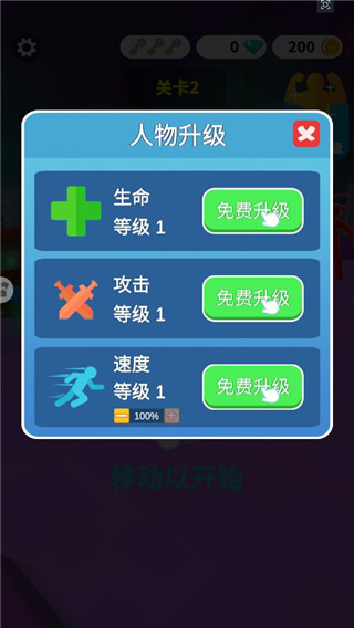 4、选择右上角的人物升级可以提升角色的各项属性,第一次是免费的,后续就要花费金币或者钻石了。