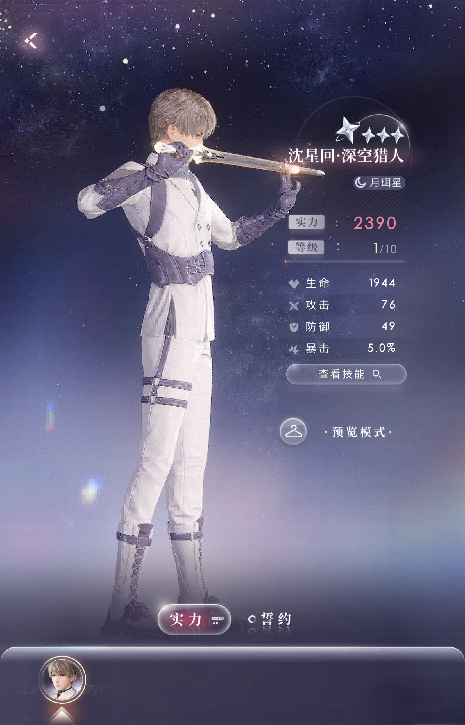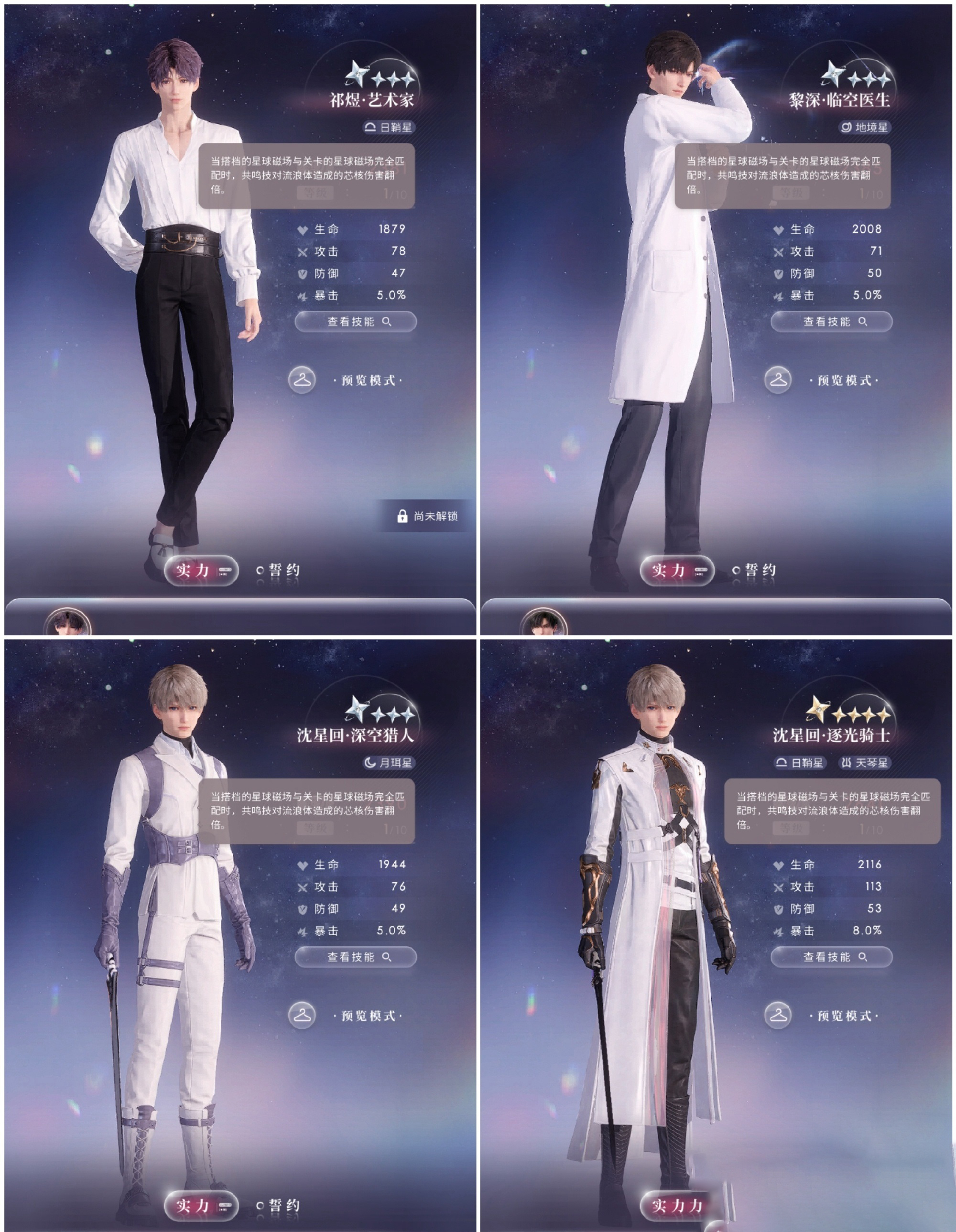 以沈星回为例,五星“逐光骑士”与四星“深空猎人”套装相比较: