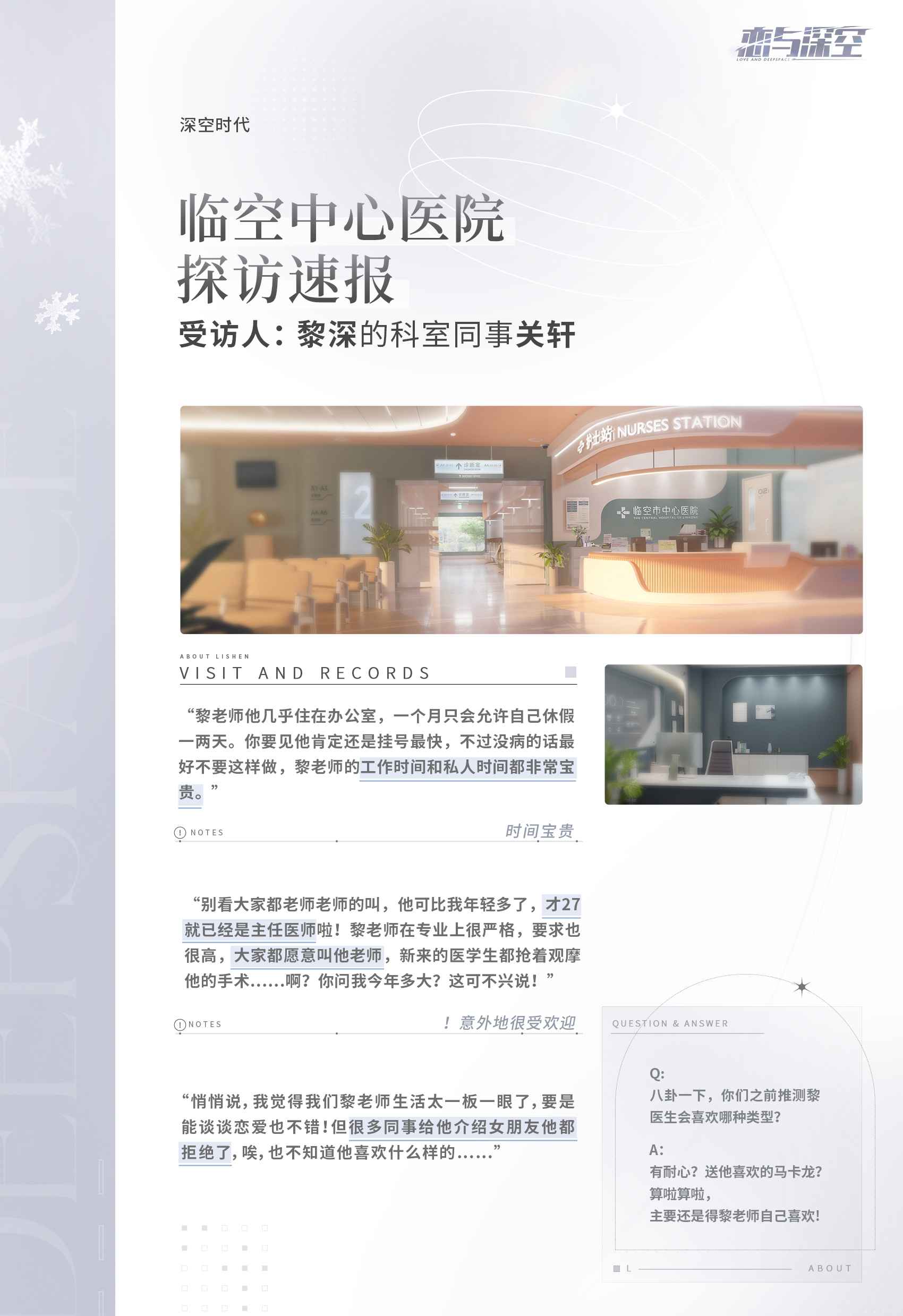 根据之前了解的情况,通讯社成员预约了黎医生日程相对空闲的一天来到临空中心医院,希望能当面邀请黎深参与我们的访谈。