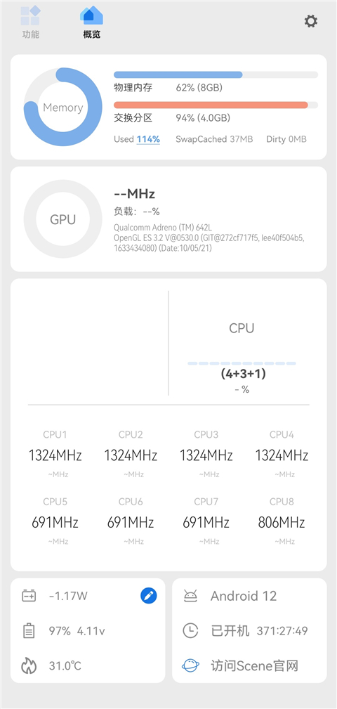 1、基础模式 在基础模式下,可以使用部分查看功能。 2、ADB模式 在ADB模式下,可以使用大部分查看功能和部分修改功能,除了可以访问Scene更多信息查看功能外还会额外开放系统应用卸载、权限管理等功能,如果你误操作卸载了重要的系统应用,可能需要恢复出厂设置才能开机。 3、ROOT模式 在ROOT模式下,可以使用所有查看和修改的功能,Scene提供的所有功能都可以被访问,其中也包括一些具有一定危险性的功能。例如:删除出厂自带应用、控制处理器性能、写入或还原系统文件。使用过程中可能会因为操作不当或功能缺陷,导致你无法进入系统界面,或者丢失重要数据。如果你从未听说过刷机、变砖、恢复出厂设置,并且没有备用设备,该模式可能并不适于你!scene9官方正版怎么开启ADB模式检测游戏帧率