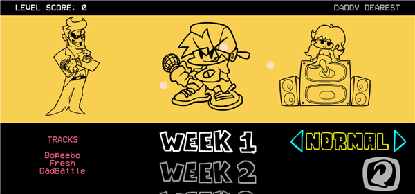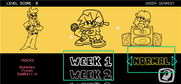 【故事模式】 游戏分为多个 Week(周),每个 Week 会有不同的对手角色与歌曲(通常 3 首)。 玩家需要依次完成这些关卡,逐渐推进剧情(核心是“男友”通过音乐对战赢得“女友”的认可)。 难度可选:Easy / Normal / Hard,高难度会增加音符数量和节奏复杂度。 1、进入游戏中,点击【STORY MODE】。