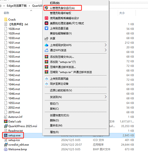 2、在QuarkXPress 2025文件夹找到“setup.exe”,并鼠标右键以管理员身份运行;