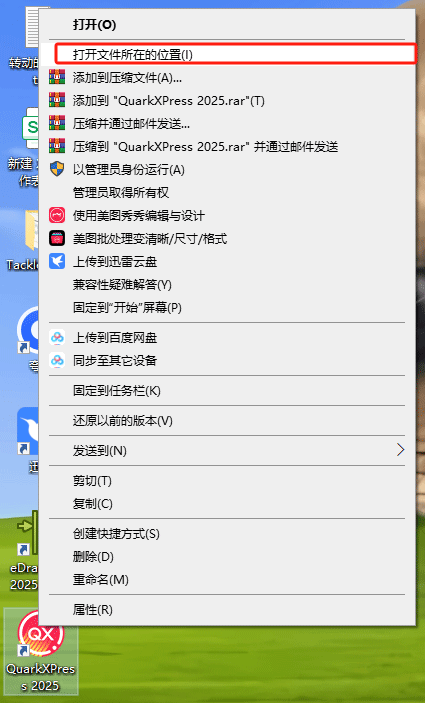 10、在桌面找到QuarkXPress 2025软件,鼠标右键点击打开文件所在的位置”进入安装目录位置;