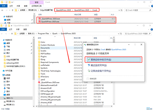 11、接着,把名为Crack的文件夹开启,然后把该文件夹内包含的两个补丁进行复制操作,再将复制好的这两个补丁粘贴到之前已打开的软件安装目录当中,以此实现对原有文件的替换。
