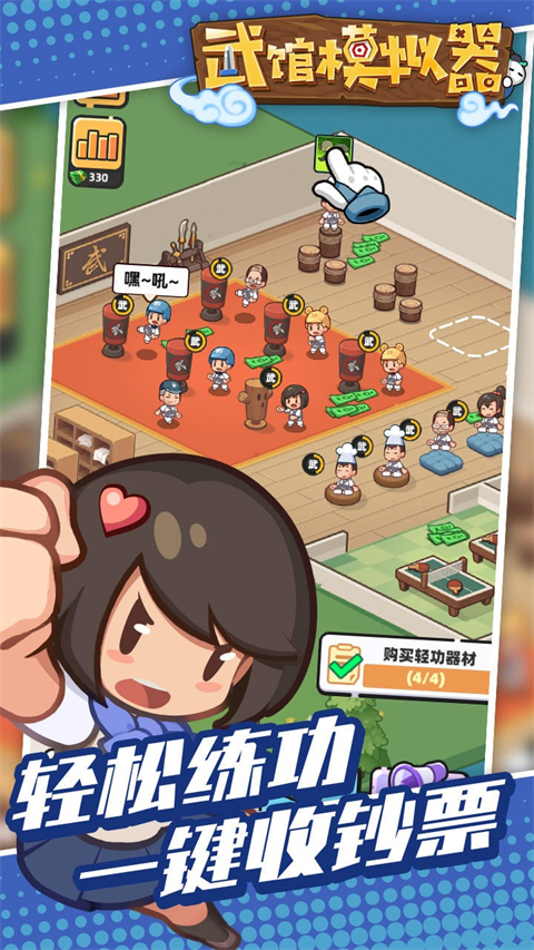 1、你需要运用你的经营头脑,不断的提升武馆名气,吸引更多人前往; 2、游戏中每位角色形象都比较Q萌可爱,还拥有丰富趣味剧情; 3、可以装扮你武馆内饰,让你的武馆看上去更加辉煌气派; 4、通过不断地招募武馆学员,将其培养训练强大起来,获得更多的收益; 5、动漫手绘画风,加入了浓厚的武侠色彩在内,带来新颖有趣的经营。游戏亮点