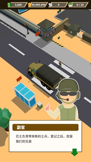 1、建造军营、训练士兵、扩张军备,一款无与伦比的军事模拟经营游戏! 在荒地上持续开垦、招兵买马、经营军队,给您最真实的部队成长体验!玩到停不下来! 2、模拟真实部队训练过程,训练体能、丛林野战、城市渗透、太空探索,多种多样的训练基地等你建造! 荒蛮沙漠、绝域北极、神秘太空,由你任意驰骋! 3、变身指挥官,组建你的第一支军队吧! 指挥你的军队出征、赚取赏金,成为极具威信与影响力的领导者!征服世界就从这里开始!口袋指挥官官方版新手攻略