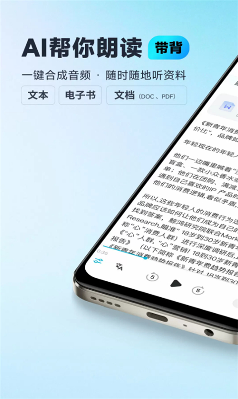 1、【文本/文档朗读】 支持将用户上传的PDF、DOC文档、电子书一键转成音频,自制有声读物。 2、【拍照朗读】 拍照后可快速扫描提取图片上的文本,并支持一键朗读。 3、【网页朗读】 输入网页链接,即可朗读网页上的内容;新闻、微信公众号文章、知乎、腾讯文档、飞书文档链接一键转为音频。 4、【AI配音】 AI帮你一键完成文本配音,主播音色自定义,多种音色任你选。 5、【AI播客】 AI一键生成双人对话播客,支持随时随地听播客音频内容; 覆盖20+播客场景,满足学习办公各类场景诉求~ 深度对话、汇报演讲、带背磨耳朵、总结概述、论文指导、作文讲解、知识科普、课件笔记、懒人读书、新闻播客、商业播客、闲聊播客、人物采访、面试模拟、辩论比赛、休闲娱乐、小说剧场、睡前故事。 6、【AI总结】 AI一键总结全文重点,核心内容一目了然,文档、书籍速读; 同时支持一键朗读总结内容。 7、【AI脑图】 AI一键生成脑图,快速梳理内容框架及逻辑; 同时支持一键保存脑图笔记。 8、【实时录音转写】 无需等待,边说边转文字。毫秒级别实时录音转写,识别结果准确率领先,11种语音自由转写。 9、【多语种同传翻译】 支持110种语言,高效精准翻译,实时将文本翻译为任意语言,解决跨语言交流障碍。 10、【笔记保存】 一键保存有声笔记内容,知识回顾超方便~有道文档FM App链接转播客怎么用