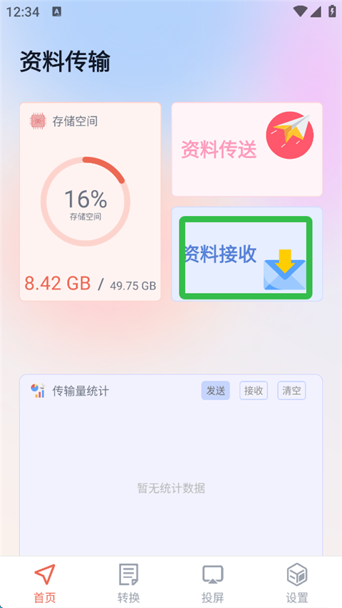 5、打开新设备上的茄子快传app,点击【资料接收】。