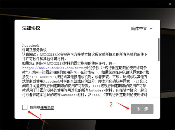 4、勾选我同意使用条款,然后下一步。