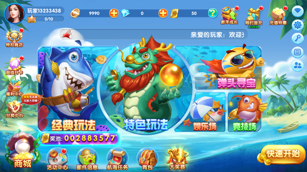 【超多福利,大量金币免费领】 登录就送海量金币,每日任务、节日玩法,多重福利领到手软。 【免费VIP,不肝不氪称霸服务器】 免费玩家赠送VIP等级,享受VIP同等福利。 【超高炮倍,金币炸翻天】 一亿炮倍,一炮赚千亿,金币不停赚赚赚。 【BOSS鱼种类多样,捕鱼不疲倦】 中外神话、动漫机甲、古代历史等题材应有尽有,使您在酣畅淋漓捕鱼的同时,享受古今中外文化熏陶。 【丰富的小游戏玩法,额外的金币奖励】 龙巢探险、海神宝藏、龙宫寻宝、蟠桃盛宴等小游戏随机触发,给您送上丰厚的金币奖励。游戏截图