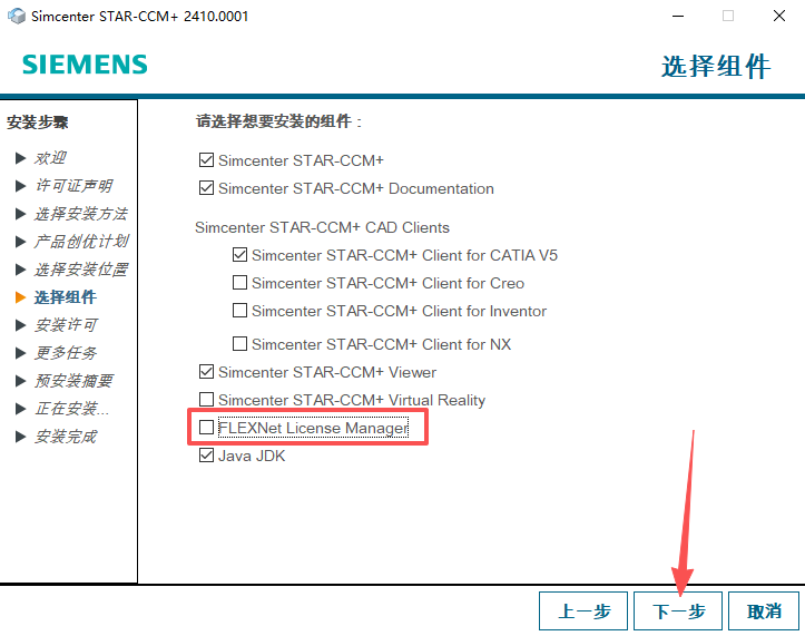 8、取消勾选【FLEXNet License Manager】,点击【下一步】。