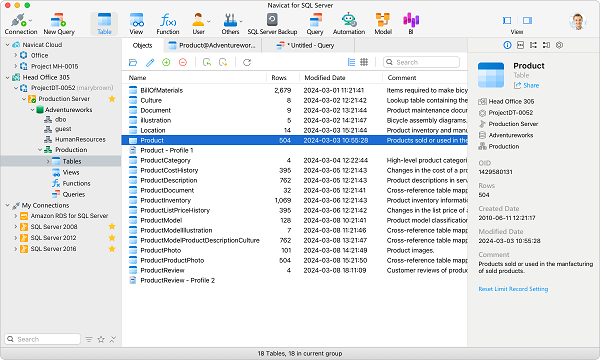 Navicat for SQL Server Mac版是一套专为 SQL Server设计的全面的图形化数据库管理及开发工具,可进行创建、编辑和删除全部数据库对象,例如表、视图、函数、索引和触发器,或运行 SQL查询和脚本,查看或编辑 BLOBs、HEX、ER 图表的数据,显示表的关系。并且它还支持连接任何本地或远程 SQL Server,并与云数据库(如 Amazon RDS 和 SQL Azure)兼容;它允许您创建、编辑数据库、运行SQL查询并以更简单的方式连接到远程SQL Server;它提供了一个直观的GUI,并提供了强大的可视化工具,如查询编辑器、语法高亮显示功能、SQL预览、SQL控制台、文本、Hex和BLOB查看器/编辑器、SSH隧道等,以提高您的工作效率!