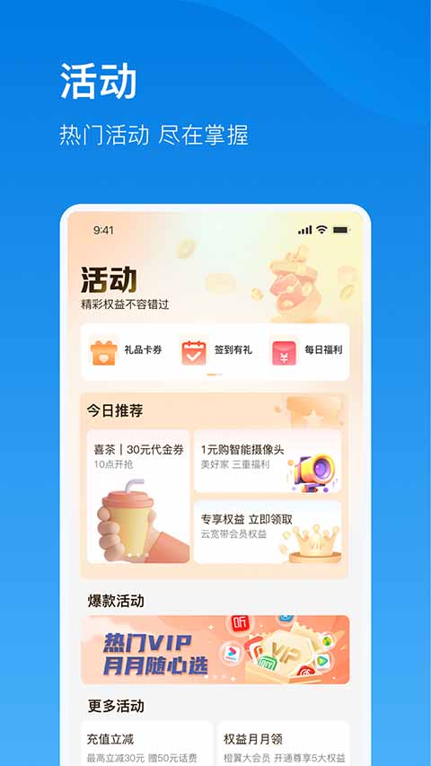 【云宽带】 面向用户,高可定制,实惠高效! 【魔都在线】 便民宽带随心享,省钱又方便! 【套餐余额】 话费流量,随时查询,方便快捷! 【业务办理】 业务套餐,账单积分,一站办理! 【专属优惠】 新人流量包,老客户流量底价购!软件功能