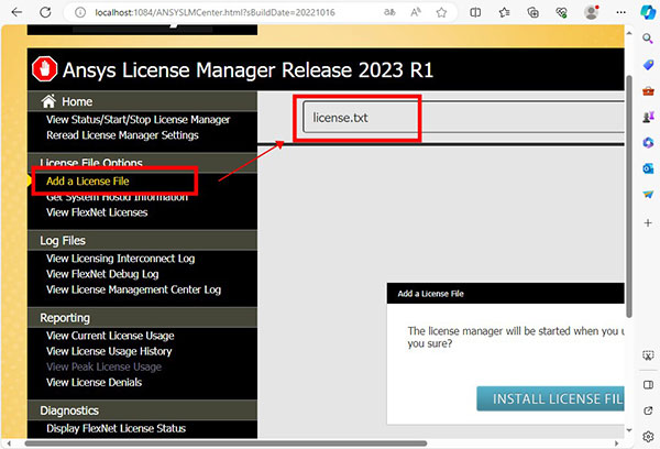 7、选择"Add a License File" > "Choose File" > 选择 "license.txt" > click "INSTALL LICENSE FILE"。