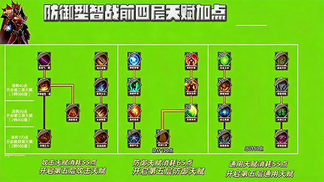 ②因为智战第五层天赋开启需要消耗175点天赋,比智弓少10点,而防御加满以及加满通用的左侧,刚好可以满足需求。