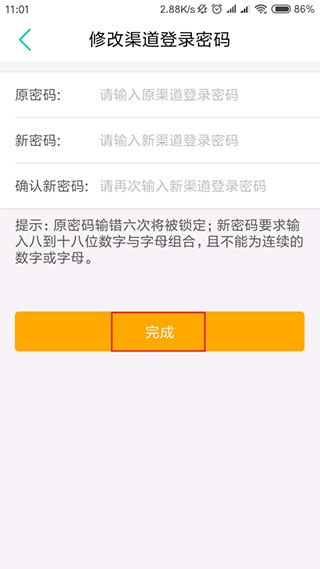 3、在打开的密码修改页面中,输入原先的登录密码和新密码,确认之后,点击“完成”按钮即可。