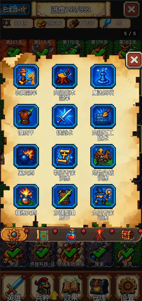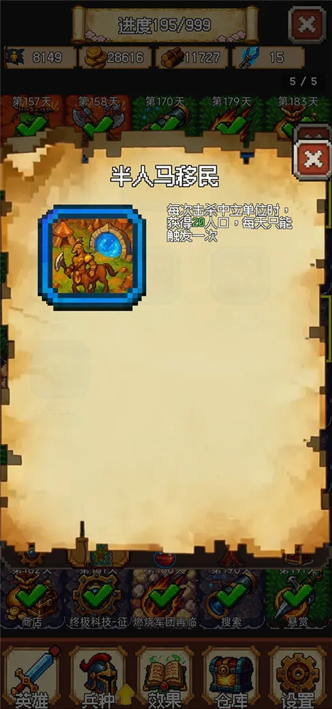 1、探索地块会发生的内容丰富多样,包括建造、科技、招募、灾变、商店、搜索、悬赏、打野、地下城、守塔。 2、建造和科技类事件需消耗金币、木材,大多数建筑有前置建筑要求,多数科技有人口要求; 3、招募可以获得种族兵种或者中立兵种,种族兵种需要提前造出各个兵营类建筑;灾变会带来各种削弱效果或者敌人强化; 4、商店能消耗金币选择购买一次性自动使用的道具,需要提前建造商店建筑;搜索可免费获取随机奖励; 5、悬赏需完成指定条件解锁属性提升奖励; 6、打野可以获得经验奖励,提升英雄等级,解锁英雄的4个技能;地下城战斗难度较高,并且需要地下城玥石才能进入; 7、守塔每 30 天出现一次,和敌对种族进行决战,失败会结束游戏。更新日志