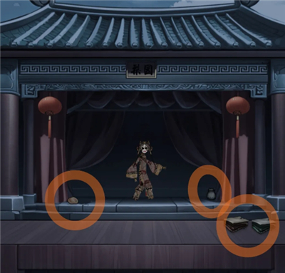 走右面拿取戏台左右的物品,茶包和胭脂,台子上还有红绿两种颜色的戏服