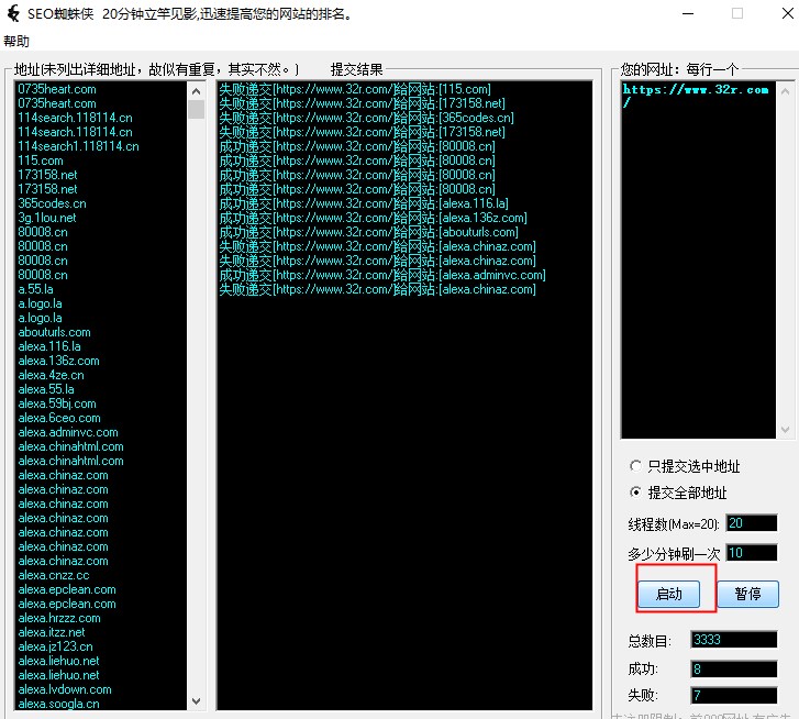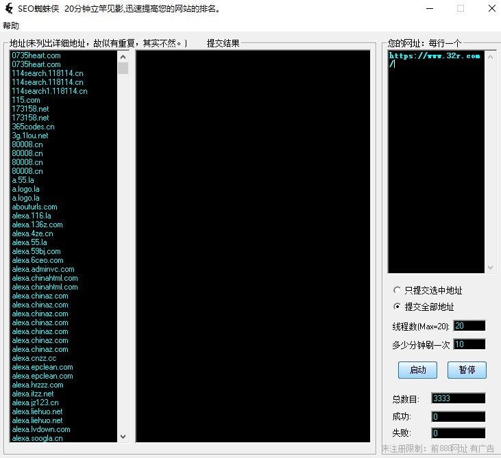 1、搜索引擎蜘蛛吸引工具,3000多个网站目录一起抓取你的网站,2、google、yahoo等各大在搜索引擎上效果可达20分钟收录网站,10天后查询域名增加上万条,