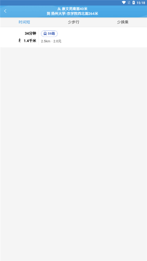 5、另外点击导乘板块中,我们输入起点和终点并对其搜索,即可为我们推荐时间短、少步行、少换乘三种方案;