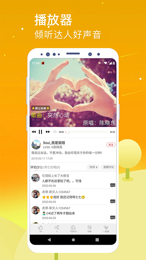 1、K歌房(仿佛置身于KTV,与三五好友实时K歌。家族K歌房,玩转你的音乐朋友圈)。 2、每日精选(首页人气板块,不间断搜罗平台好声音)。 3、星打歌(用海报宣传我的歌~从此妈妈再也不怕我的好嗓子石沉大海了~) * 我是星探(用你挑剔的耳朵搜寻潜藏的好声音,还能赚金币哦)。 4、合唱(双人深情对唱、多人合唱随心唱)。 5、缤纷多彩的家族活动等你来捧场。更新日志
