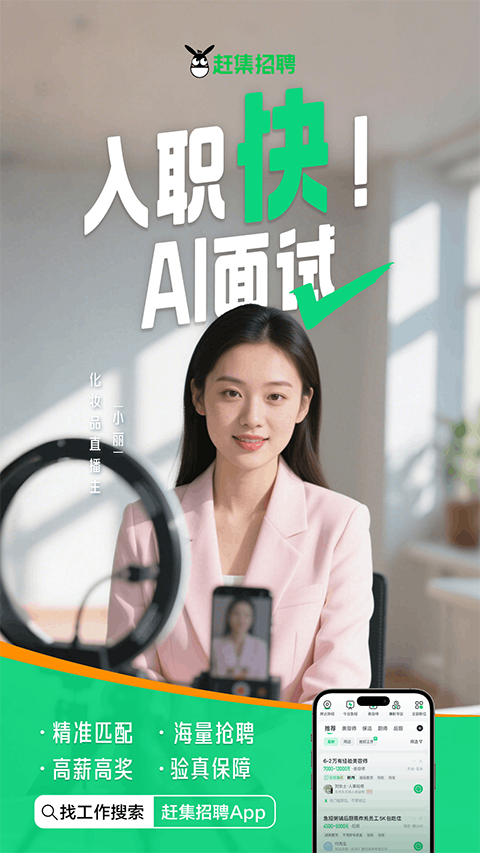 1、聊天找工作 像微信一样,与主管在线聊天,直接招,入职快。 2、找附近工作 轻松找到离家近的高薪职位,提升你的生活质量。 3、看企业直播 观看企业直播招聘,工作环境、福利待遇提前了解,躺着找到满意工作。 4、同城老乡会 相亲、交友、找老乡,工作生活两不误。 5、福利更全面 包吃包住包底薪……这些福利还没入职你就知道!赶集招聘app怎么切换求职状态